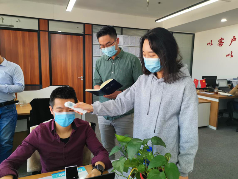 二是必须测温。公司内全员工作期间佩戴口罩,办公室前台设置测温点,并放置消毒湿巾和酒精喷雾,每天早晨使用电子测温枪依次测量体温后,方可进入工作区域。每日至少测温两次并做好详细记录和钉钉员工健康每日打卡及行程路线登记。